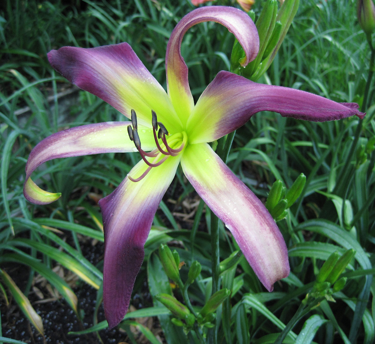 WINGED WATERFALL is a flying UF pinched crispate. WINGED WATERFALL's 10.5" petals come closer to a true blue-purple than I've ever seen. The sepals are lighter. A faint blue-purple eye and enormous green throat complete this breakthrough colored UF. WINGED WATERFALL has 3-4 way branching, 30 buds and is quite fertile both ways.