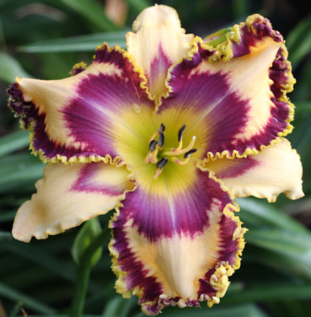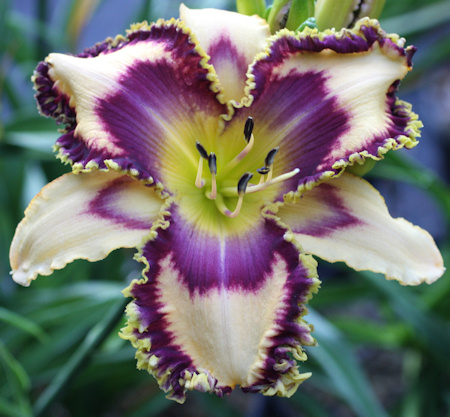 TOSS THE FEATHERS is a tall, very large 7 plus inch daylily with light orange-yellow petals & sepals, a large semi patterned blue-purple eye and edge and a yellow-gold serrated outer edge. Green throat. 3-way branching, 20 buds. Easily fertile both ways.