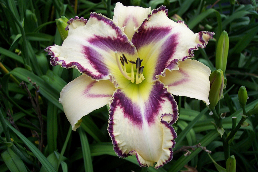 ANGEL FAIRY TERN is a clear large warm cream with a stunning inner red-purple and outer fuchsia eye. The edge is distinctly triple edged in inner fuchsia, then red-purple, and a cream outer edge with cream white teeth. ANGEL FAIRY TERN has produced beautiful teethy seedlings in both full and UF forms with 3 to 4-way branching and 20 buds. Fertile both ways.